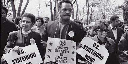 Delegate Eleanor Holmes Norton, Shadow Senator Jesse Jackson, and Mayor Sharon Pratt Kelly at a statehood rally in 1992